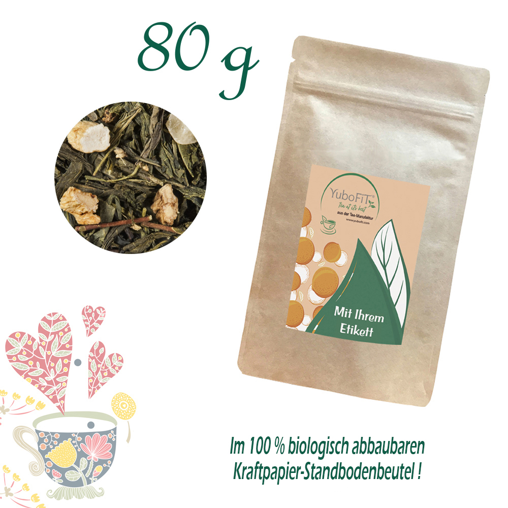 Grüner Tee China Sencha (82 %), Ingwerstücke (5 %), Ananaswürfel (Ananas, Zucker) (5 %), Ginsengwurzel (4,5 %), Aromen