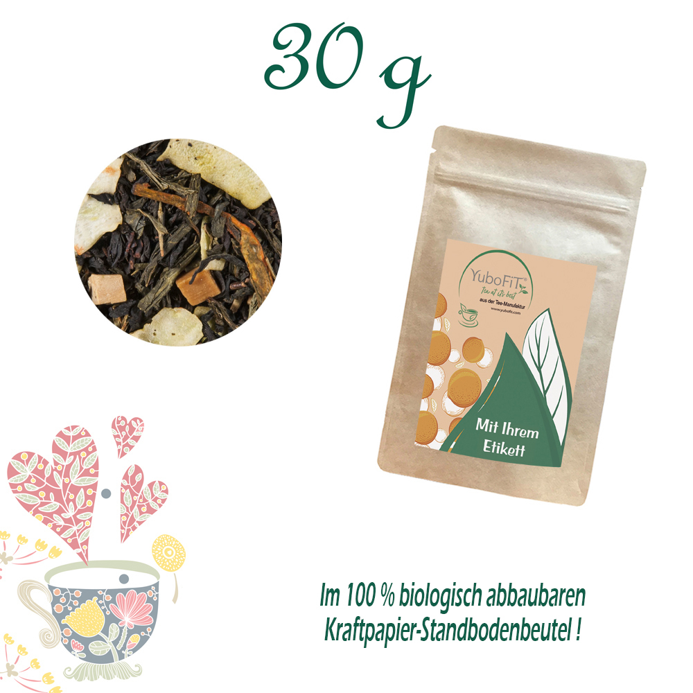 Schwarzer Tee (43 %), Grüner Tee China Sencha (36 %), Kokosnusschips (8%), Karamellstücke (gezuckerte Kondensmagermilch, Zucker, Glukosesirup, Butterfett, Feuchthaltemittel: E420, Emulgator: E471), Aromen, Krokantstücke (Zucker, Haselnuss) (3 %)Kann Spuren anderer Nüsse enthalten.