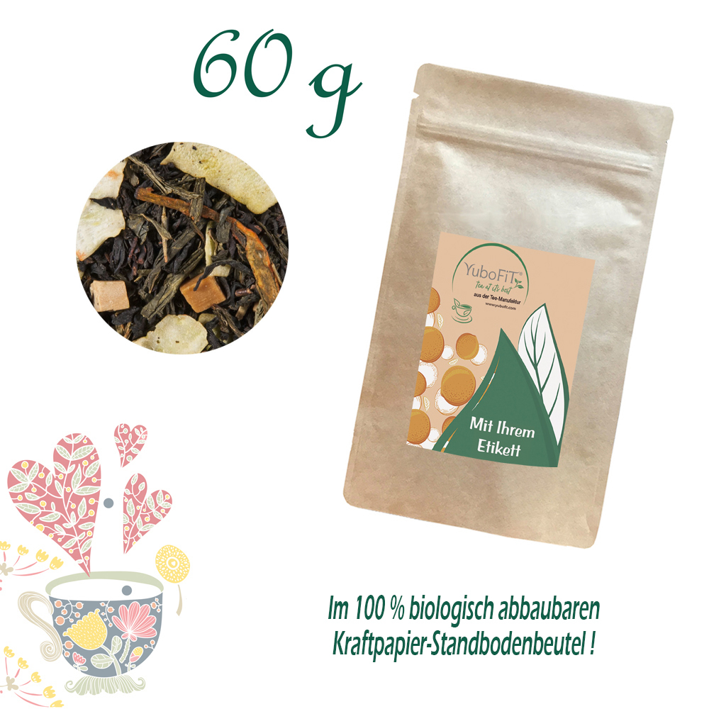 Schwarzer Tee (43 %), Grüner Tee China Sencha (36 %), Kokosnusschips (8%), Karamellstücke (gezuckerte Kondensmagermilch, Zucker, Glukosesirup, Butterfett, Feuchthaltemittel: E420, Emulgator: E471), Aromen, Krokantstücke (Zucker, Haselnuss) (3 %)Kann Spuren anderer Nüsse enthalten.