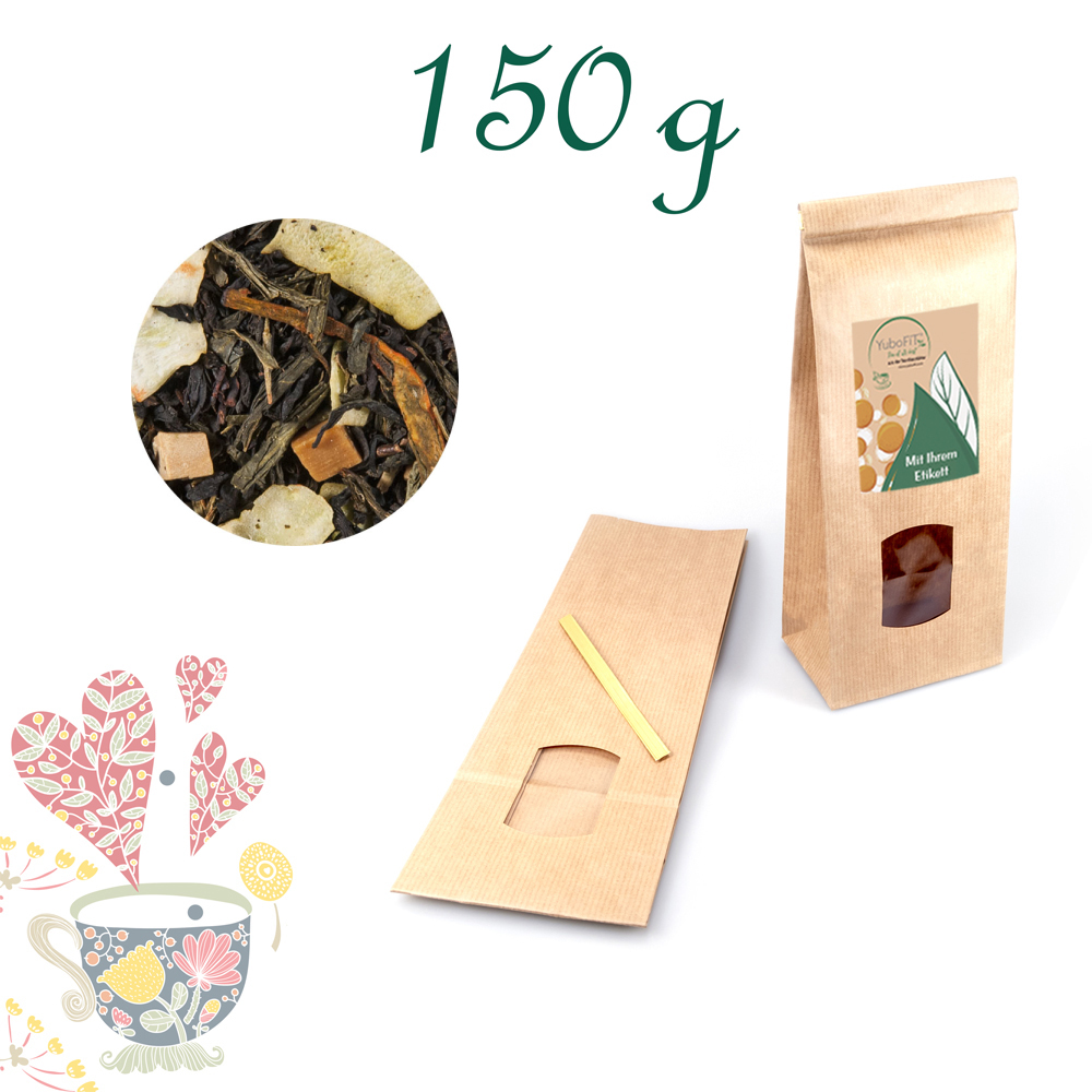 Schwarzer Tee (43 %), Grüner Tee China Sencha (36 %), Kokosnusschips (8%), Karamellstücke (gezuckerte Kondensmagermilch, Zucker, Glukosesirup, Butterfett, Feuchthaltemittel: E420, Emulgator: E471), Aromen, Krokantstücke (Zucker, Haselnuss) (3 %)Kann Spuren anderer Nüsse enthalten.