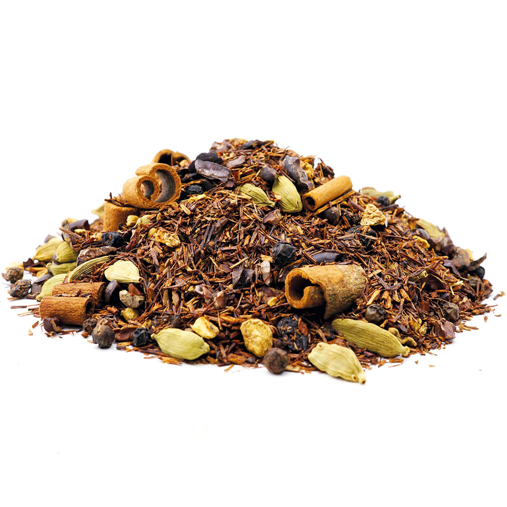 Rotbuschtee (34%), Kakaobohnenstücke (20%), Zimtstangen, Kardamom, Ingwer, geröstete Zichorienwurzeln, Aroma, Schwarzer Pfeffer.