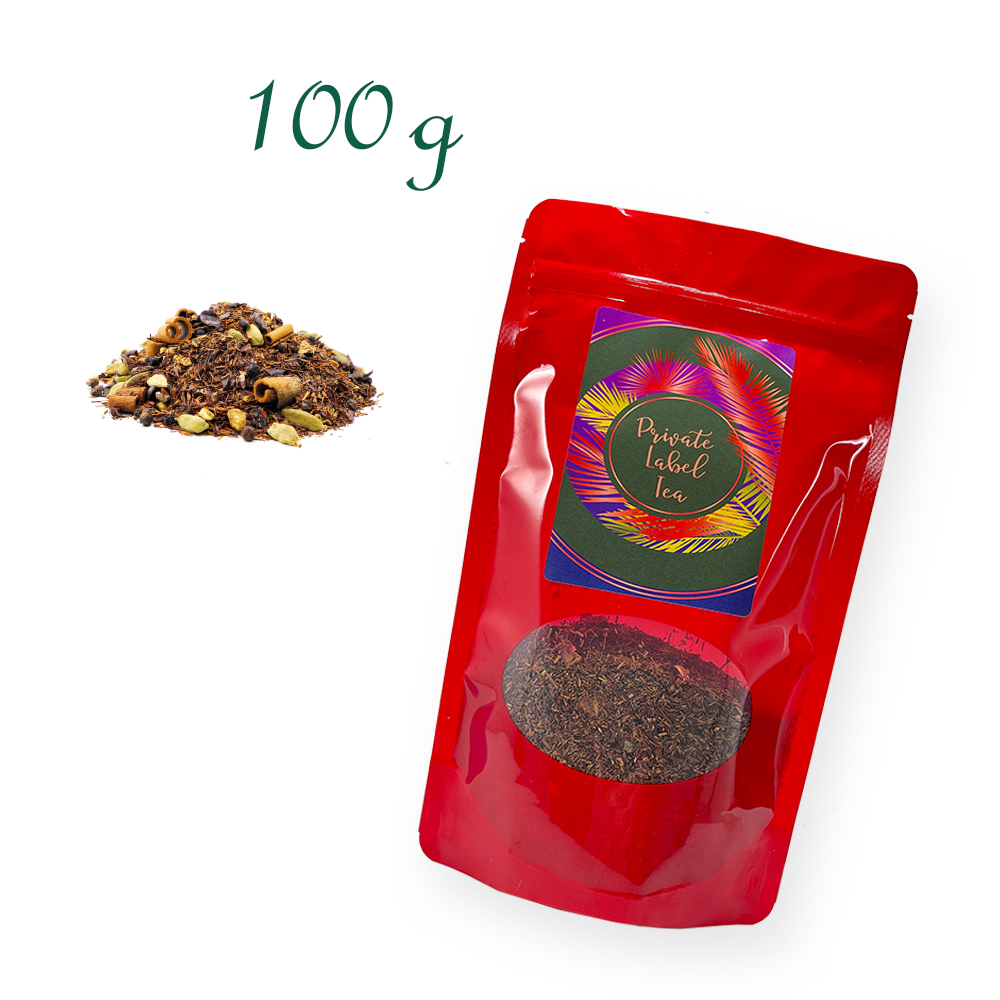 Rotbuschtee (34%), Kakaobohnenstücke (20%), Zimtstangen, Kardamom, Ingwer, geröstete Zichorienwurzeln, Aroma, Schwarzer Pfeffer.