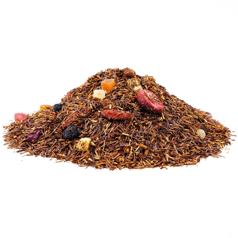 Rotbuschtee (70%), Gojibeeren (5%), Aroma, Drachenfruchtstücke, Ananasstücke (Ananas, Zucker, Säuerungsmittel: Zitronensäure), Papayastücke (Papaya, Zucker), Cranberries (3%), Aroniabeeren, Kiwistücke.