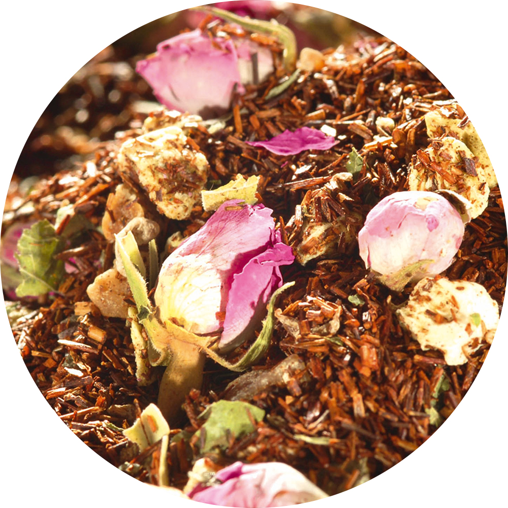 Rotbuschtee (83%), Rosenknospen, Feigenstücke, Aroma, Kiwistücke, Brombeerblätter.