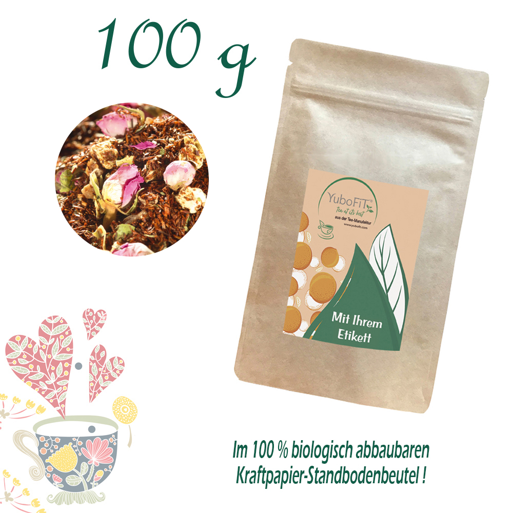 Rotbuschtee (83%), Rosenknospen, Feigenstücke, Aroma, Kiwistücke, Brombeerblätter.