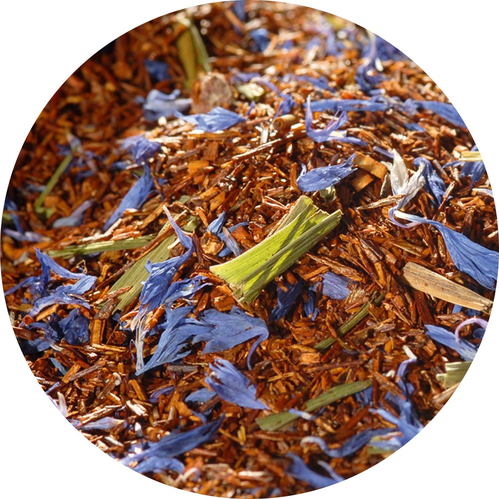 Rotbuschtee (90%), natürliches Orangen-Aroma, Schokolade (2%) (Zucker, VOLLMILCHPULVER, Kakaobutter, Kakaomasse, SÜSSMOLKENPULVER, Emulgator: SOJALECITHIN), Zitronengras, Kornblumenblüten.