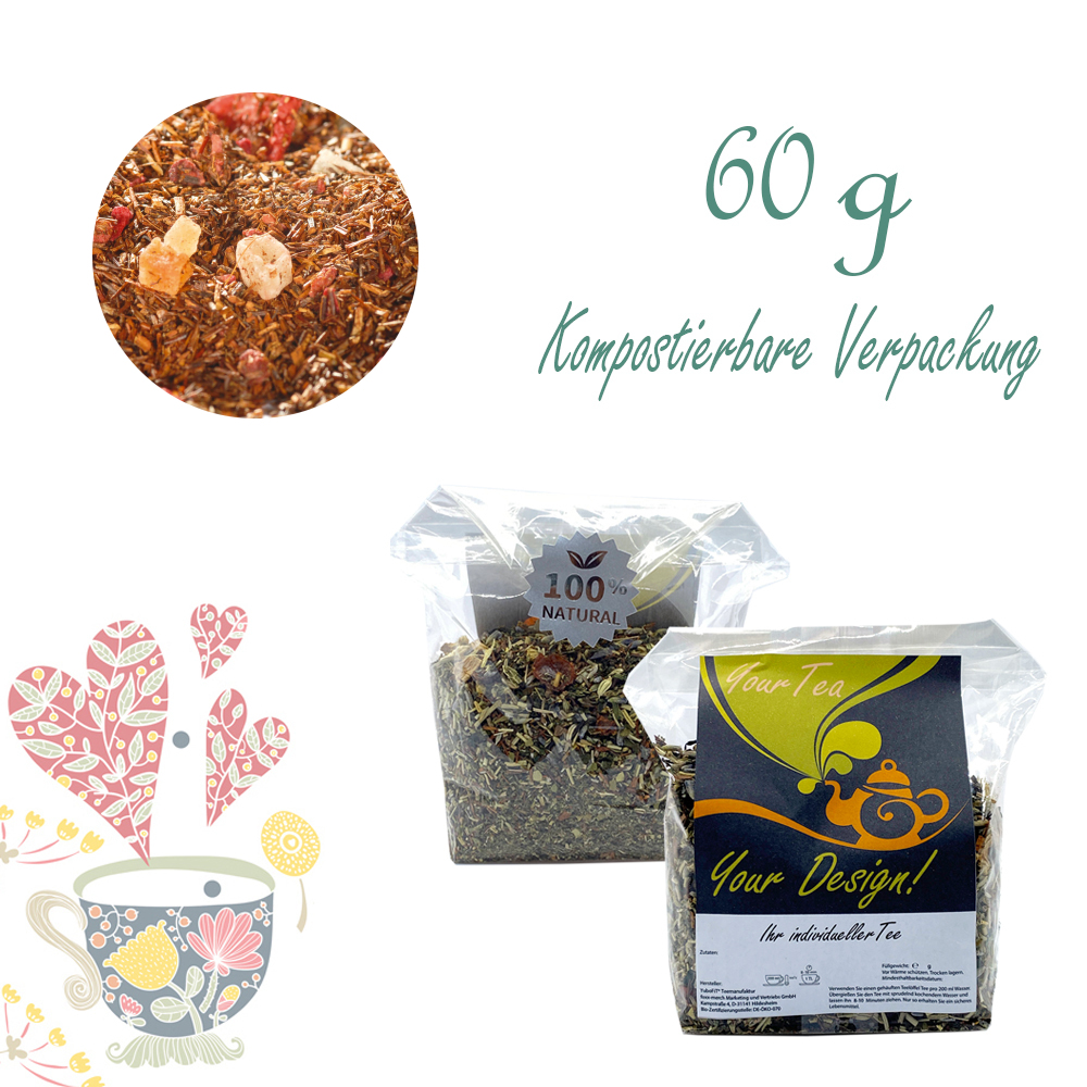 Rotbuschtee (83%), Ananasstücke (Ananas, Zucker, Säuerungsmittel: Zitronensäure), Papayastücke (Papaya, Zucker), Aroma, Himbeerstücke, natürliches Aroma, Erdbeerscheiben.