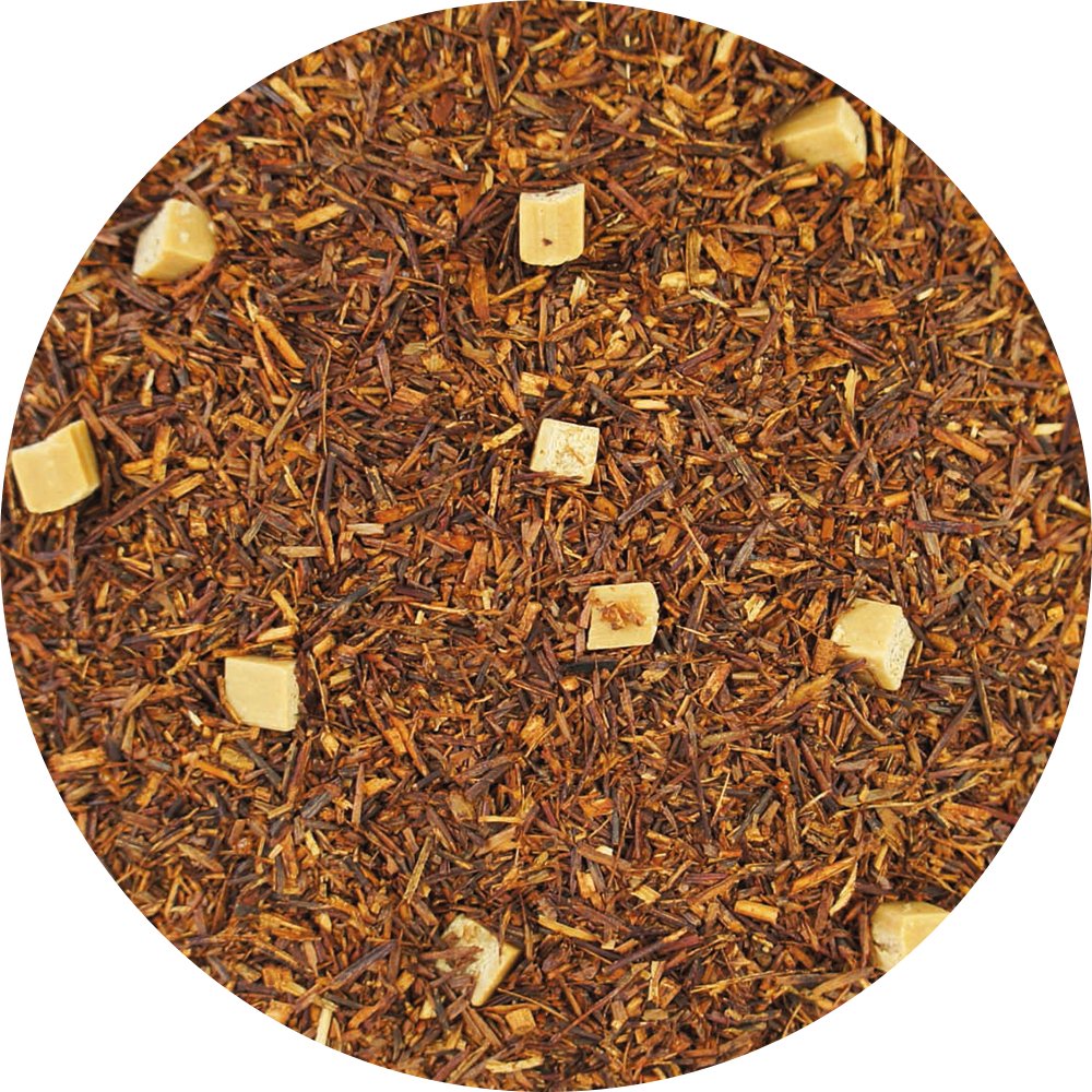 Rotbuschtee (89%), Karamellstücke (8%) (MAGERKONDENSMILCH, Zucker, Glukosesirup, BUTTERFETT, Feuchthaltemittel: Sorbitsirup, Emulgator: Monound Diglyceride von Speisefettsäuren), Aroma.