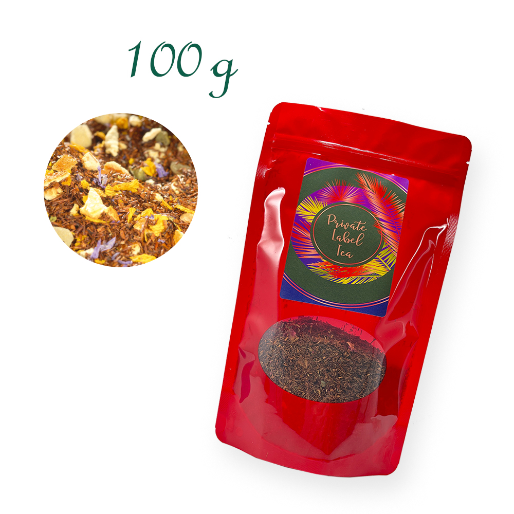 Rotbuschtee (80%), Ananasstücke (Ananas, Zucker, Säuerungsmittel: Zitronensäure), Aroma, Orangenschalen, Papayastücke (Papaya, Zucker), Mangostücke (2%) (Mango, Zucker, Säuerungsmittel: Zitronensäure), Sonnenblumenblüten, Malvenblüten.