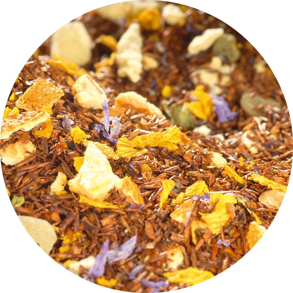 Rotbuschtee (80%), Ananasstücke (Ananas, Zucker, Säuerungsmittel: Zitronensäure), Aroma, Orangenschalen, Papayastücke (Papaya, Zucker), Mangostücke (2%) (Mango, Zucker, Säuerungsmittel: Zitronensäure), Sonnenblumenblüten, Malvenblüten.