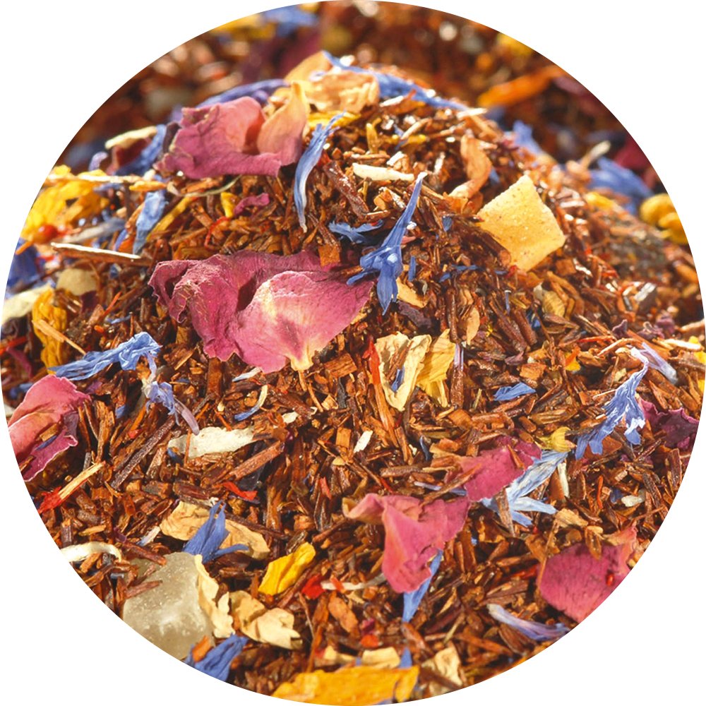 Rotbuschtee (62%), Ananasstücke (10%) (Ananas, Zucker, Säuerungsmittel: Zitronensäure), Papayastücke (Papaya, Zucker), Mangostücke (Mango, Zucker, Säuerungsmittel: Zitronensäure), Aroma, Kokosnussflocken, Rosenblütenblätter, Sonnenblumenblüten, Vanille (1%), Kornblumenblüten, Jasminblüten, Saflorblüten.