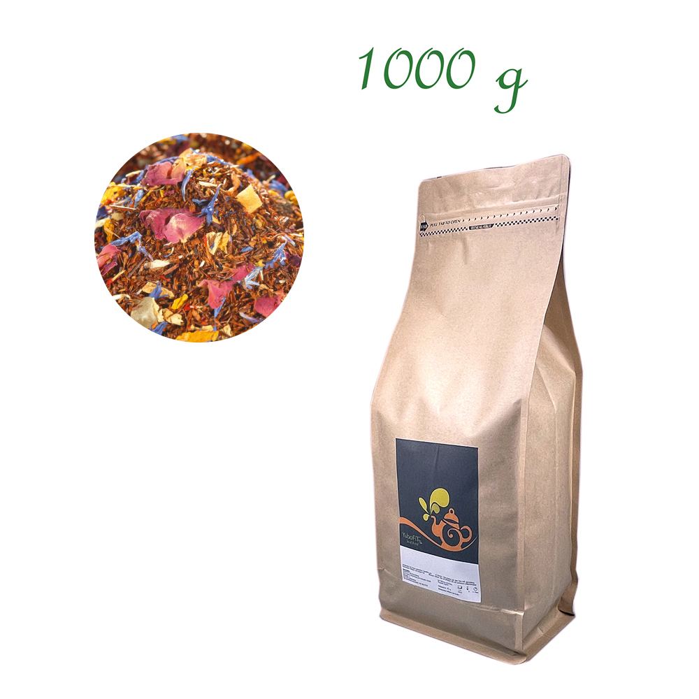 Rotbuschtee (62%), Ananasstücke (10%) (Ananas, Zucker, Säuerungsmittel: Zitronensäure), Papayastücke (Papaya, Zucker), Mangostücke (Mango, Zucker, Säuerungsmittel: Zitronensäure), Aroma, Kokosnussflocken, Rosenblütenblätter, Sonnenblumenblüten, Vanille (1%), Kornblumenblüten, Jasminblüten, Saflorblüten.