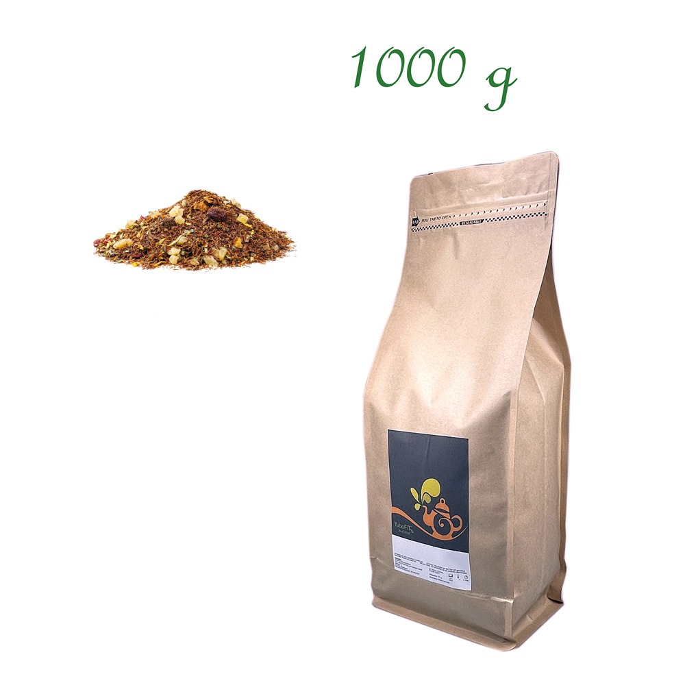 Rotbuschtee (66%), Ananasstücke (Ananas, Zucker, Säuerungsmittel: Zitronensäure), Mangostücke (Mango, Zucker, Säuerungsmittel: Zitronensäure), Apfelstücke, Haselnussblätter, Sauerkirschen, natürliches Aroma, Sonnenblumenblüten, Hagebuttenschalen, Rosenblütenblätter, Malvenblüten, Ringelblumenblüten, Pfefferminze.