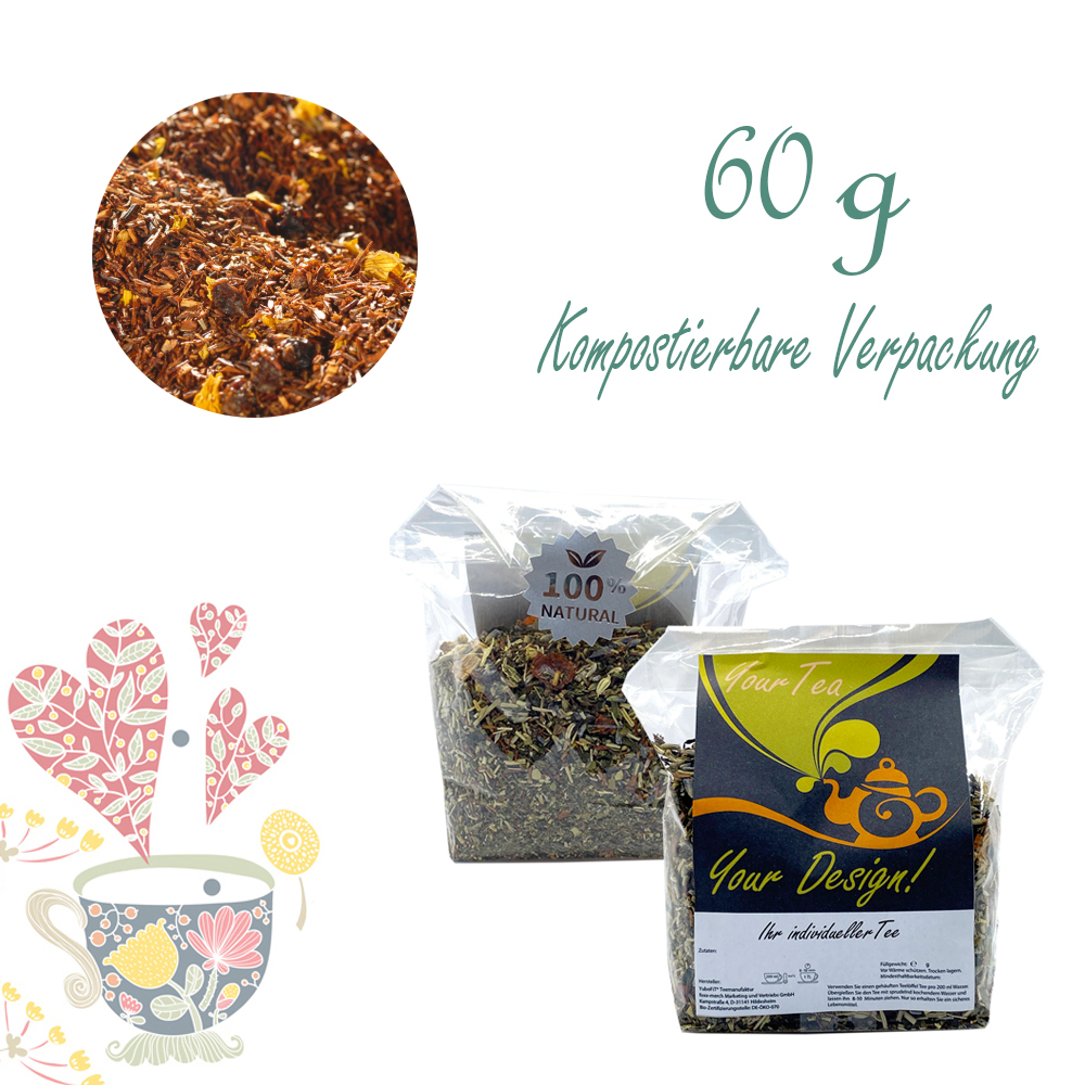 Rotbuschtee (85%), Sanddornbeeren (10%), Aroma, Sonnenblumenblüten.