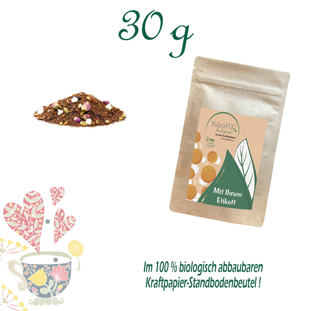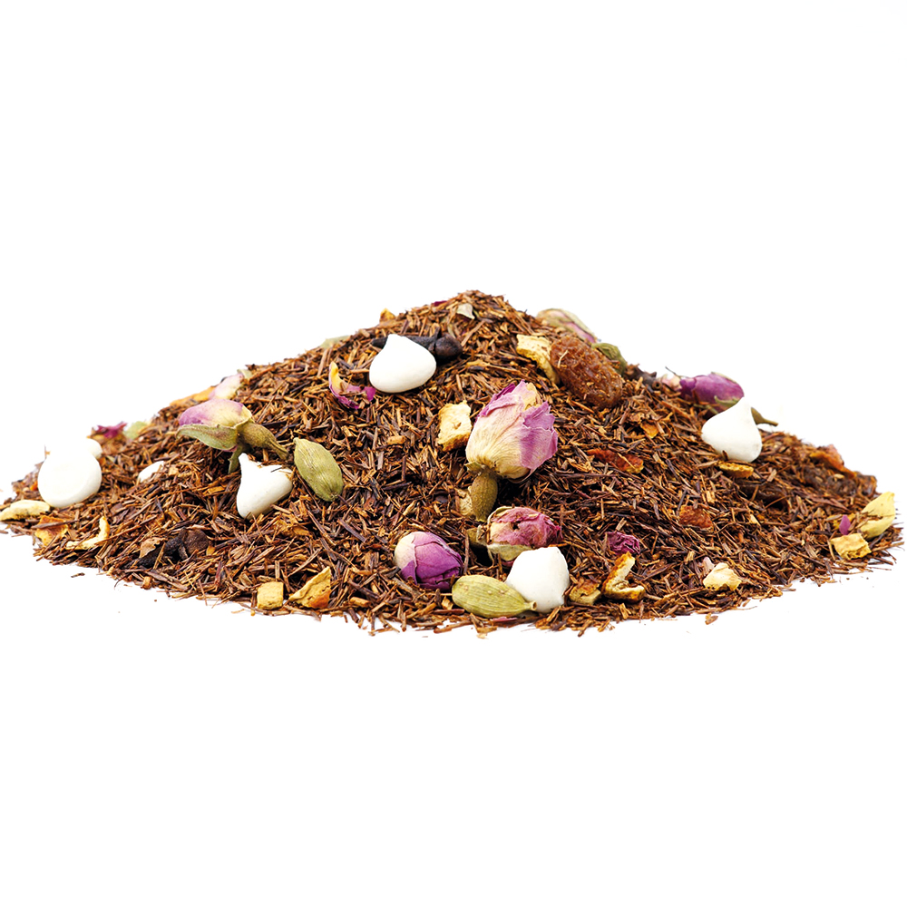 Rotbuschtee (63%), Baiserhütchen (10%) (Zucker, HÜHNEREIWEISSPULVER), Sultaninen, Rosenknospen, Orangenschalen (4%), Kardamom, Gewürznelken, Aroma, natürliches Orangen-Aroma.