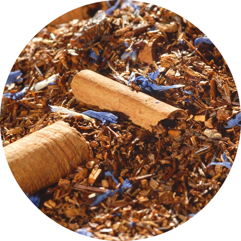 Rotbuschtee (78%), Pflaumenstücke (8%), Zimtstangen (8%), natürliches Aroma, Kornblumenblüten, Zimtstücke (1%), Aroma, natürliches Nelken-Aroma.