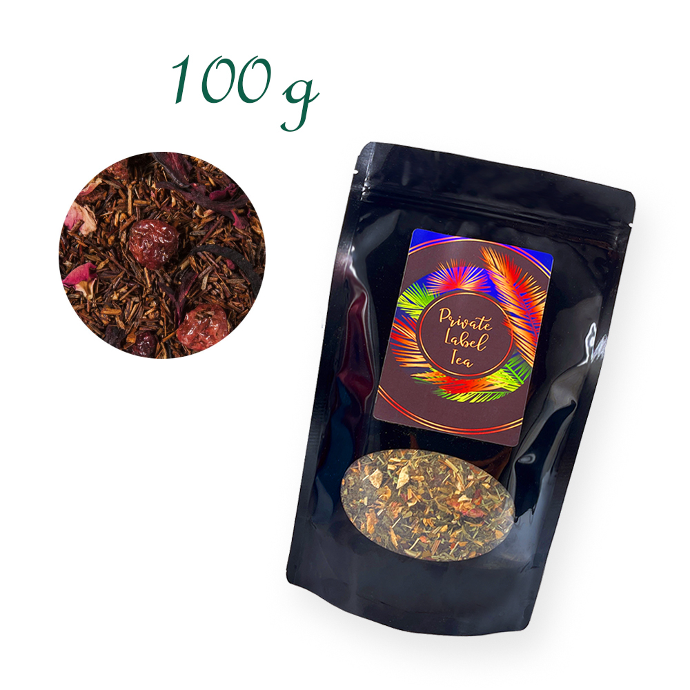 Zutaten: Rooibos, Hibiskusblüten, Aromen, Rosenblütenblätter, Rote Johannisbeeren, Himbeerstücke, Erdbeerstücke, Brombeeren