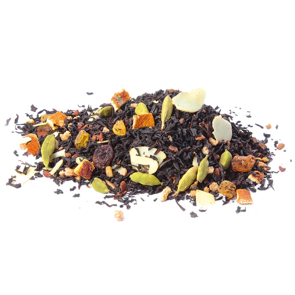 Schwarzer Tee (53%), Sultaninen, Zimtstücke (8%), HASELNUSSKROKANT (Zucker, HASELNÜSSE), Orangenschalen (6%), gelbe Sultaninen (Sultaninen, Konservierungsstoff: SCHWEFELDIOXID / SULFITE), MANDELSTÜCKE, Kardamom, Aroma.