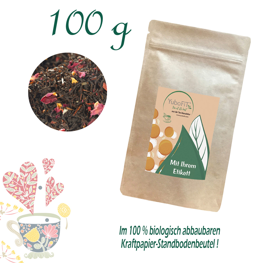 Schwarzer Tee (90%), Aroma, Kokosnussflocken, Rosenblütenblätter, Himbeerstücke.