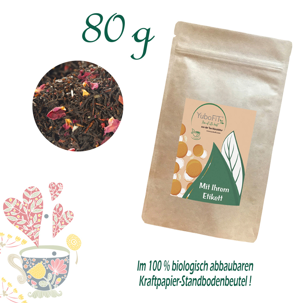Schwarzer Tee (90%), Aroma, Kokosnussflocken, Rosenblütenblätter, Himbeerstücke.