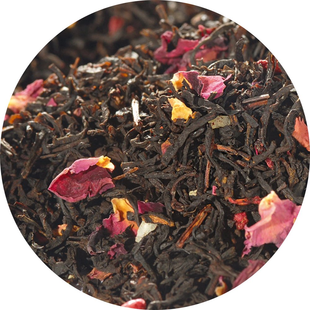 Schwarzer Tee (90%), Aroma, Kokosnussflocken, Rosenblütenblätter, Himbeerstücke.