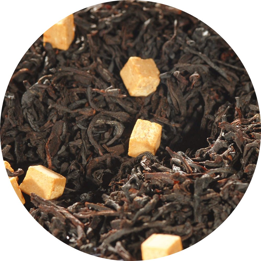 Schwarzer Tee (87%), Karamellstücke (10%) (MAGERKONDENSMILCH, Zucker, Glukosesirup, BUTTERFETT, Feuchthaltemittel: Sorbitsirup, Emulgator: Monound Diglyceride von Speisefettsäuren), Aroma.