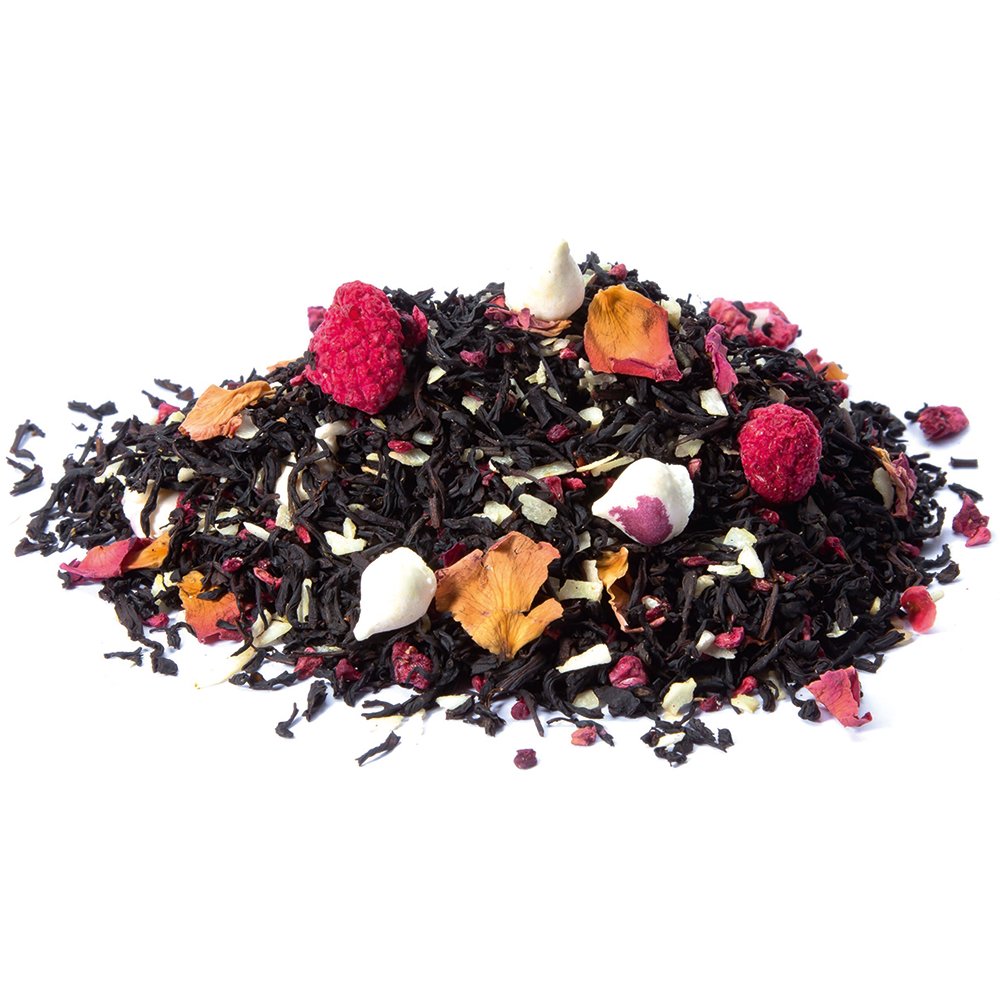 Schwarzer Tee (72%), Kokosnussflocken, Aroma, Baiserhütchen (Zucker, HÜHNEREIWEISSPULVER), Himbeerstücke (2%), Himbeeren (2%), Rosenblütenblätter.