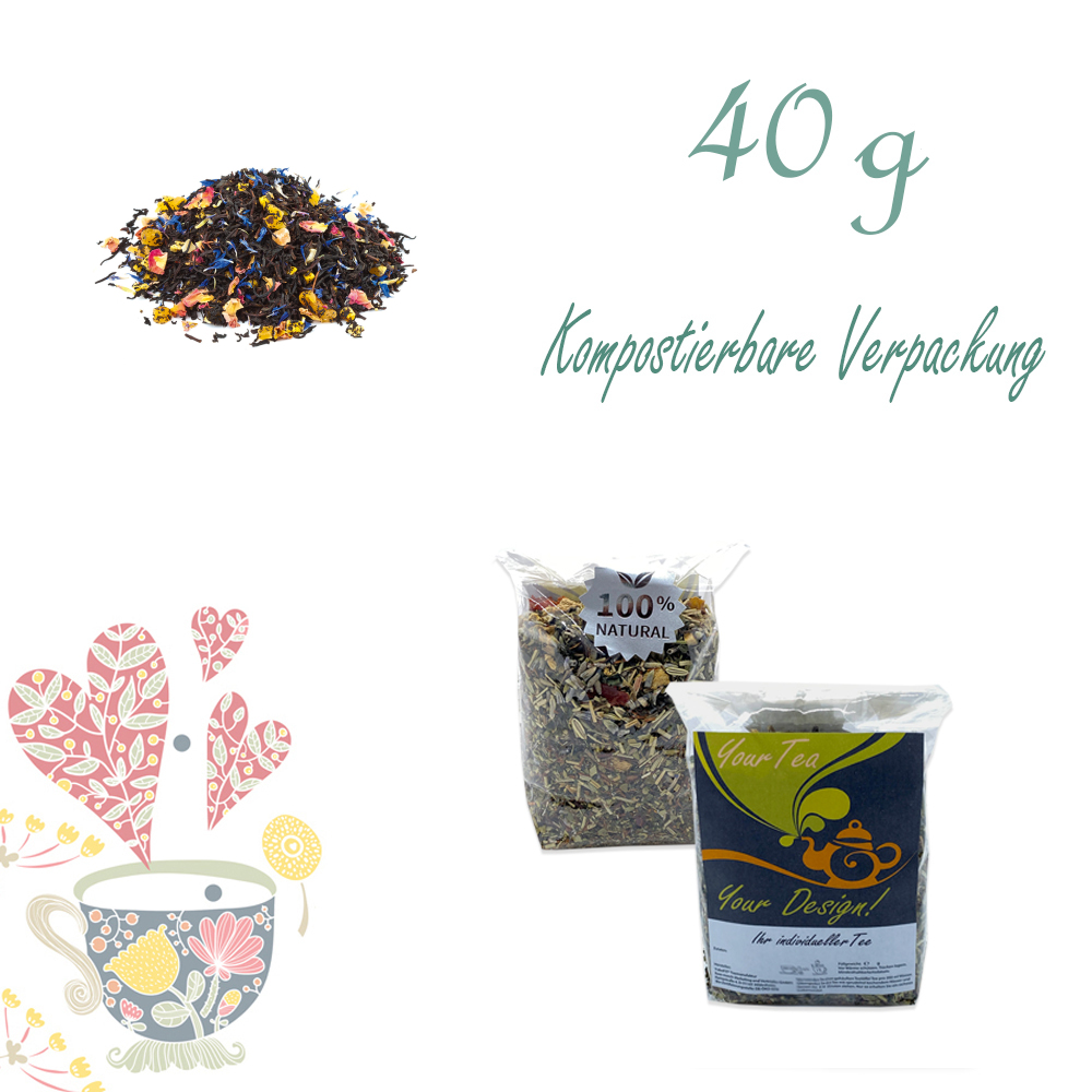 Schwarzer Tee (75%), Mangostücke (7%) (Mango, Zucker, Säuerungsmittel: Zitronensäure), Aroma, Papayastücke (Papaya, Zucker), Pfirsichstücke (3%) (Pfirsiche, Zucker), Rosenblütenblätter, Kornblumenblüten.