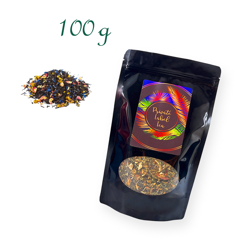 Schwarzer Tee (75%), Mangostücke (7%) (Mango, Zucker, Säuerungsmittel: Zitronensäure), Aroma, Papayastücke (Papaya, Zucker), Pfirsichstücke (3%) (Pfirsiche, Zucker), Rosenblütenblätter, Kornblumenblüten.