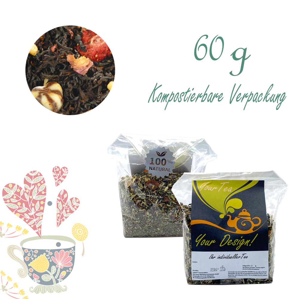 Schwarzer Tee (73%), Zartbitterschokolade mit weißer Schokolade (15%) (Zucker, Kakaomasse, Kakaobutter, VOLLMILCHPULVER, BUTTERREINFETT, fettarmes Kakaopulver, Emulgator: Sonnenblumenlecithin), MANDELSTÜCKE, Aroma, Rosenblütenblätter, Erdbeerscheiben (1%).