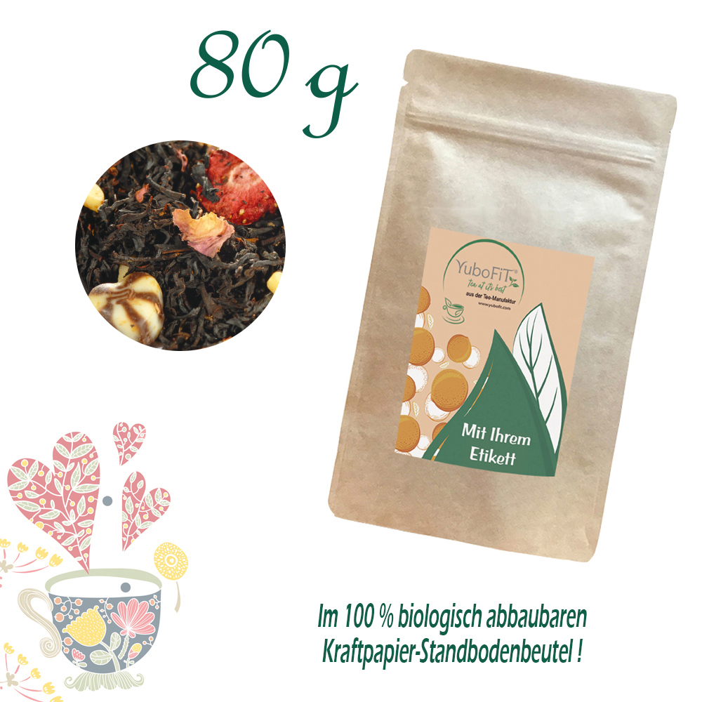 Schwarzer Tee (73%), Zartbitterschokolade mit weißer Schokolade (15%) (Zucker, Kakaomasse, Kakaobutter, VOLLMILCHPULVER, BUTTERREINFETT, fettarmes Kakaopulver, Emulgator: Sonnenblumenlecithin), MANDELSTÜCKE, Aroma, Rosenblütenblätter, Erdbeerscheiben (1%).