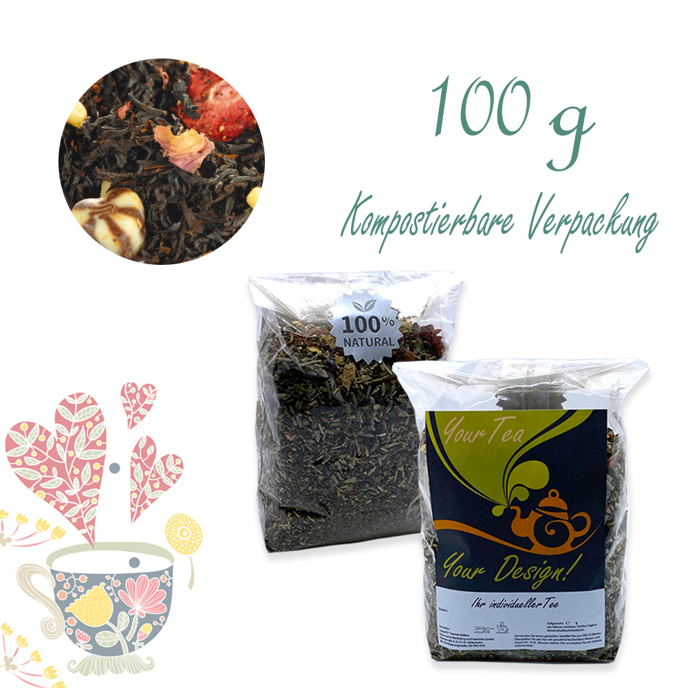 Schwarzer Tee (73%), Zartbitterschokolade mit weißer Schokolade (15%) (Zucker, Kakaomasse, Kakaobutter, VOLLMILCHPULVER, BUTTERREINFETT, fettarmes Kakaopulver, Emulgator: Sonnenblumenlecithin), MANDELSTÜCKE, Aroma, Rosenblütenblätter, Erdbeerscheiben (1%).