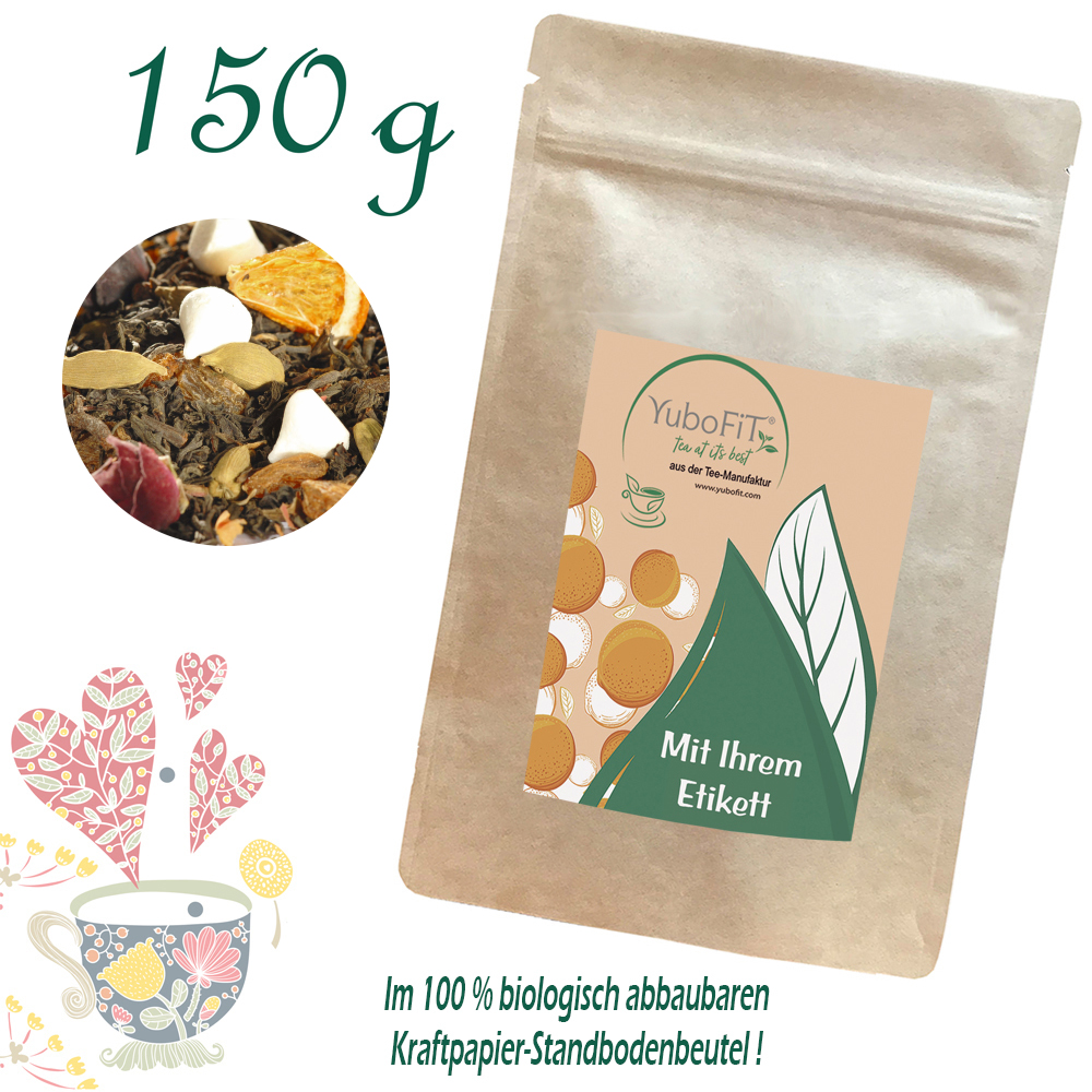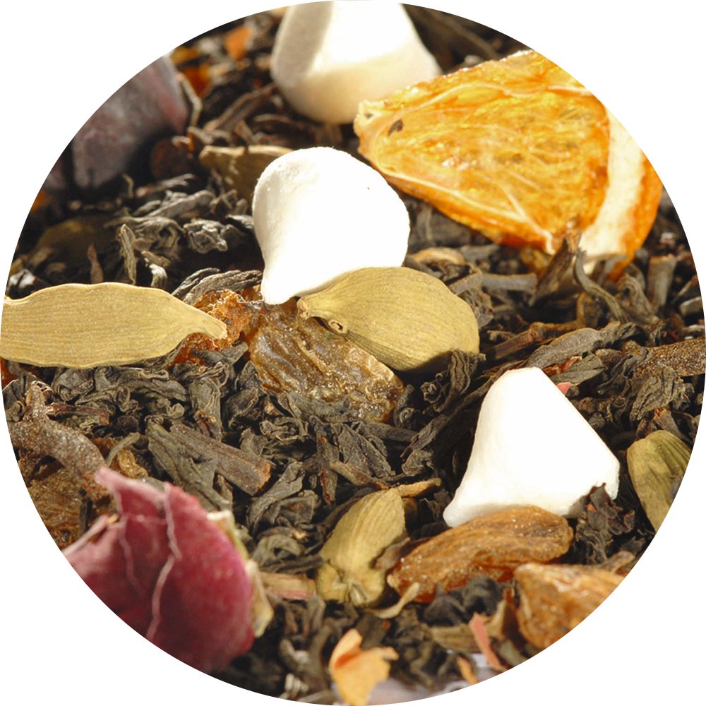 Schwarzer Tee (62%), Baiserhütchen (10%) (Zucker, HÜHNEREIWEISSPULVER), Sultaninen, Rosenknospen, Orangenecken (6%), Kardamom, Gewürznelken, Aroma, natürliches Orangen-Aroma.