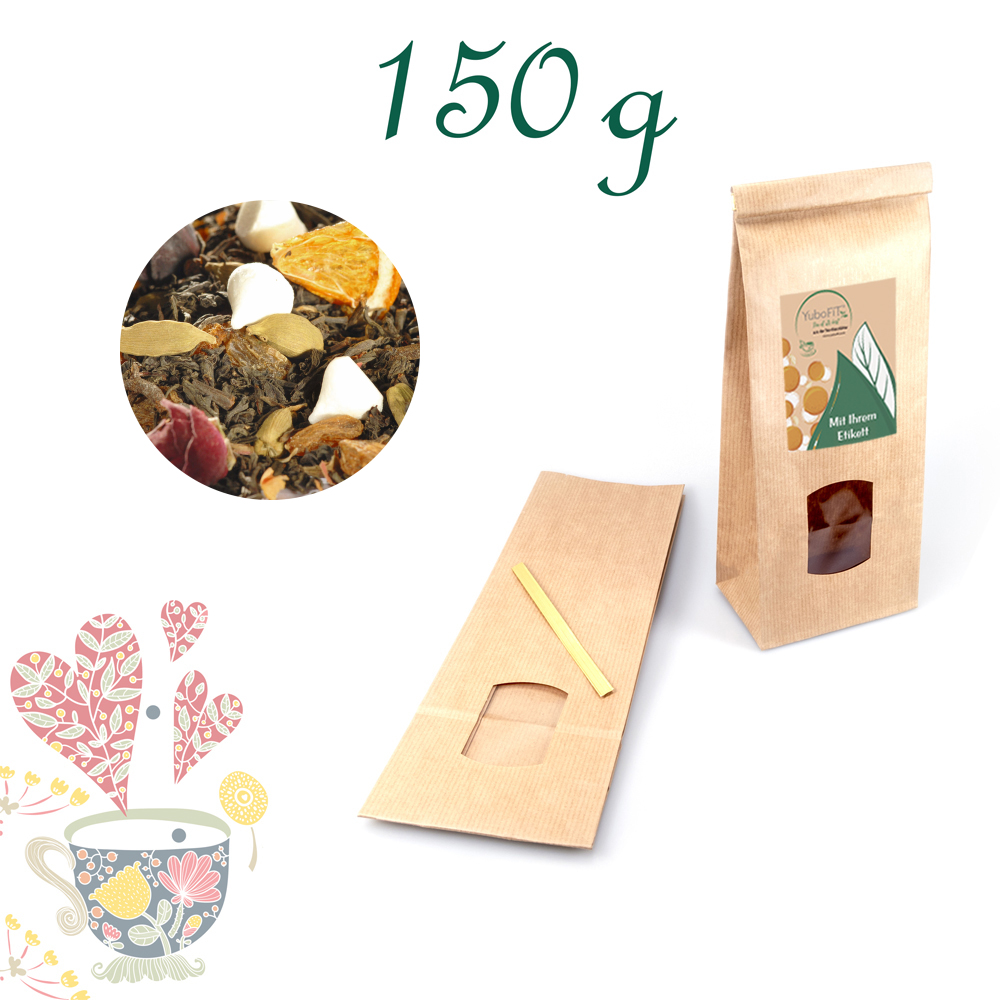 Schwarzer Tee (62%), Baiserhütchen (10%) (Zucker, HÜHNEREIWEISSPULVER), Sultaninen, Rosenknospen, Orangenecken (6%), Kardamom, Gewürznelken, Aroma, natürliches Orangen-Aroma.