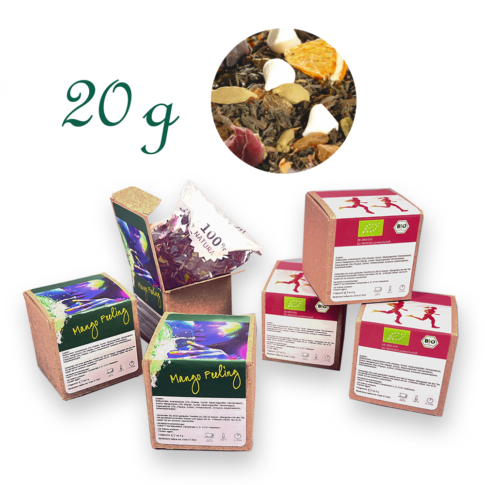 Ökologisch umverpackt mit unlackierter Recyclingkarton Faltschachtel und kompostierbarem Zellglas-Beutel. Geprägtes Siegel aus Zuckerrohrpapier mit biologischem Klebstoff. Alles komplett abbaubar.