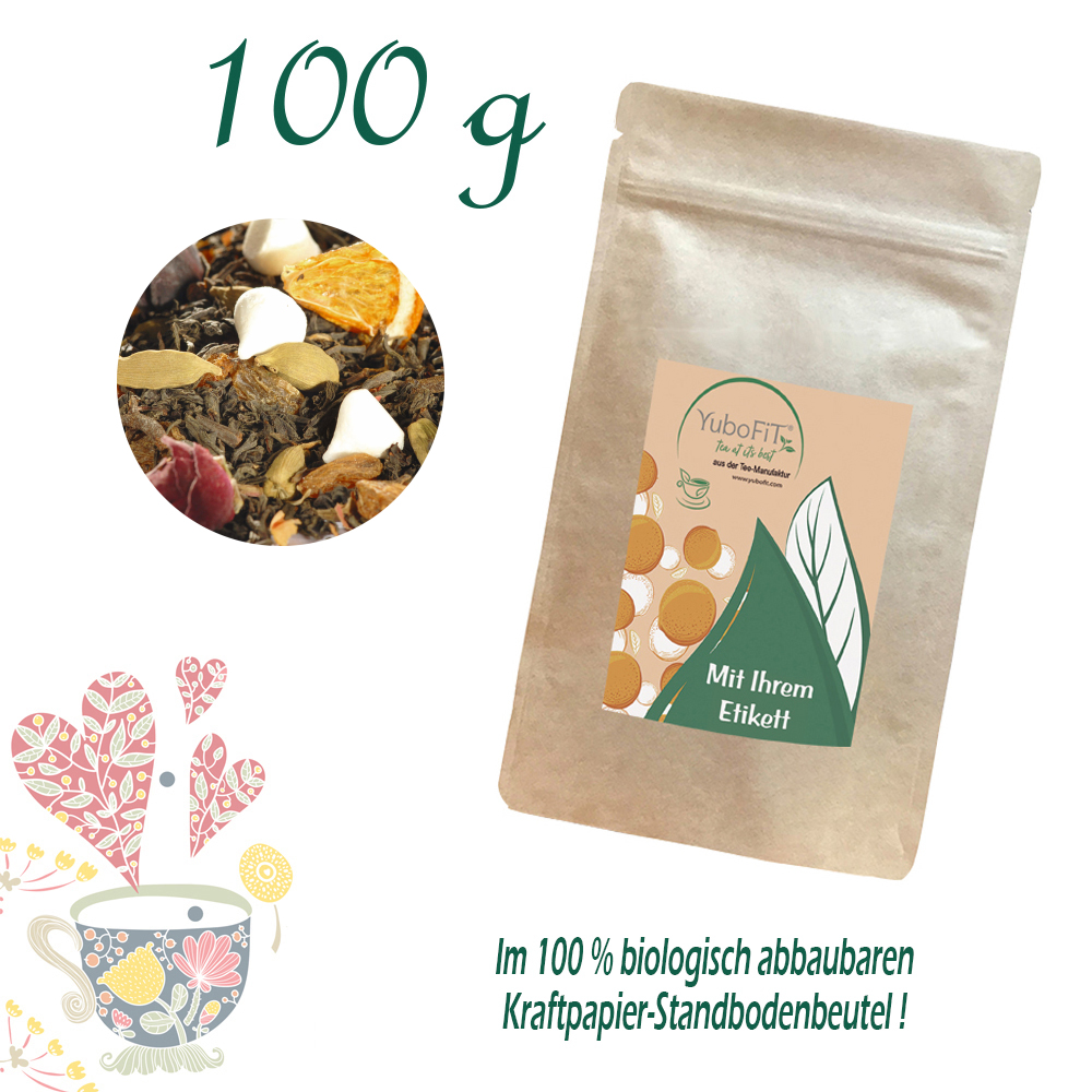 Schwarzer Tee (62%), Baiserhütchen (10%) (Zucker, HÜHNEREIWEISSPULVER), Sultaninen, Rosenknospen, Orangenecken (6%), Kardamom, Gewürznelken, Aroma, natürliches Orangen-Aroma.