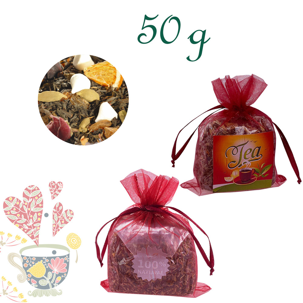 Schwarzer Tee (62%), Baiserhütchen (10%) (Zucker, HÜHNEREIWEISSPULVER), Sultaninen, Rosenknospen, Orangenecken (6%), Kardamom, Gewürznelken, Aroma, natürliches Orangen-Aroma.