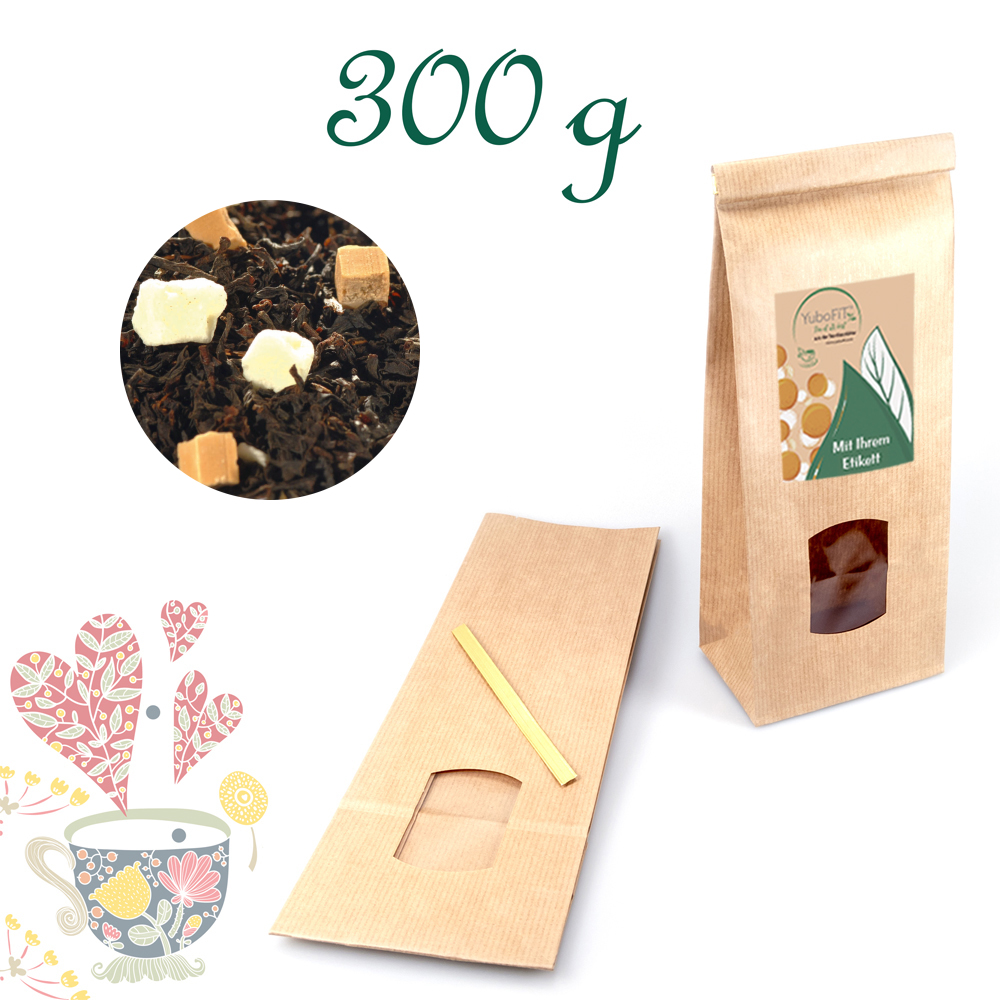 Schwarzer Tee (81%), Karamellstücke (7%) (MAGERKONDENSMILCH, Zucker, Glukosesirup, BUTTERFETT, Feuchthaltemittel: Sorbitsirup, Emulgator: Monound Diglyceride von Speisefettsäuren), Joghurtgranulat (7%) (Glukosesirup, MAGERMILCHJOGHURT, Zucker, modifizierte Stärke, Säuerungsmittel: Zitronensäure), Aroma.