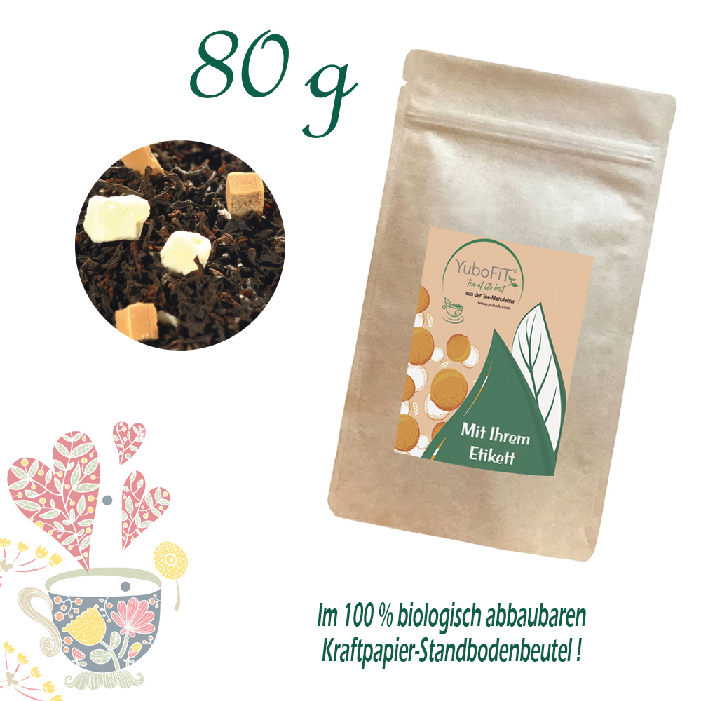 Schwarzer Tee (81%), Karamellstücke (7%) (MAGERKONDENSMILCH, Zucker, Glukosesirup, BUTTERFETT, Feuchthaltemittel: Sorbitsirup, Emulgator: Monound Diglyceride von Speisefettsäuren), Joghurtgranulat (7%) (Glukosesirup, MAGERMILCHJOGHURT, Zucker, modifizierte Stärke, Säuerungsmittel: Zitronensäure), Aroma.