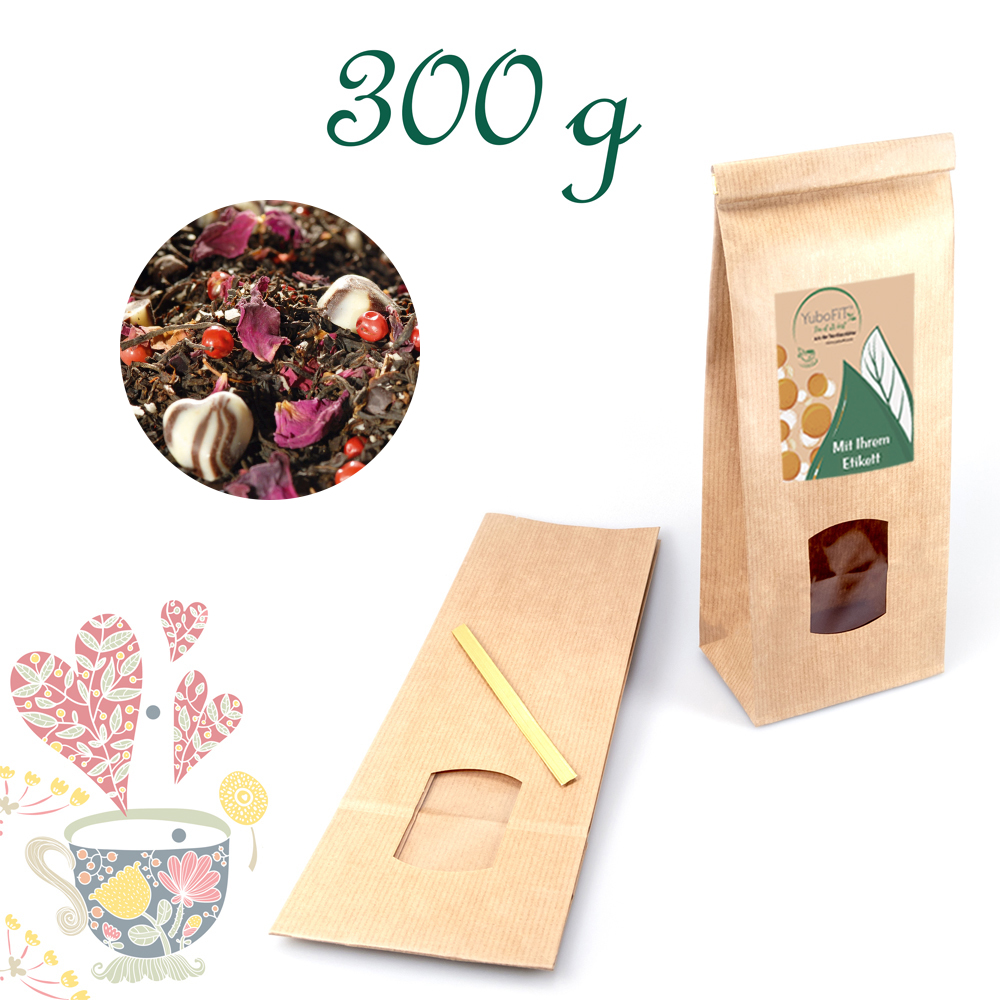 Schwarzer Tee (69%), Zartbitterschokolade mit weißer Schokolade (15%) (Zucker, Kakaomasse, Kakaobutter, VOLLMILCHPULVER, BUTTERREINFETT, fettarmes Kakaopulver, Emulgator: Sonnenblumenlecithin), Kakaobohnenstücke (5%), Aroma, Rosa Pfeffer, Kokosnussflocken, Rosenblütenblätter.
