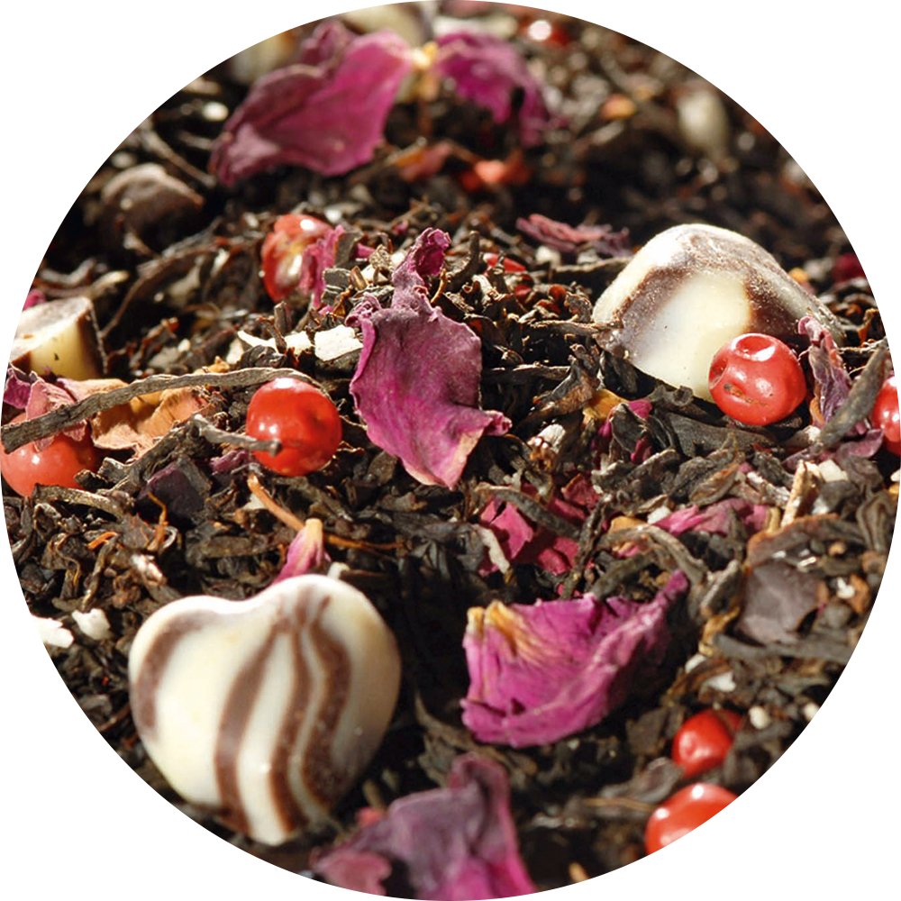 Schwarzer Tee (69%), Zartbitterschokolade mit weißer Schokolade (15%) (Zucker, Kakaomasse, Kakaobutter, VOLLMILCHPULVER, BUTTERREINFETT, fettarmes Kakaopulver, Emulgator: Sonnenblumenlecithin), Kakaobohnenstücke (5%), Aroma, Rosa Pfeffer, Kokosnussflocken, Rosenblütenblätter.