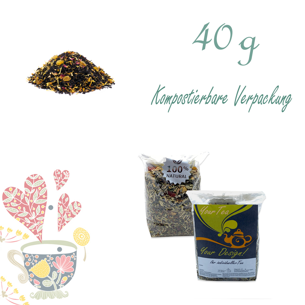 Schwarzer Tee (54%), Oolong Tee, gelbe Sultaninen (Sultaninen, Konservierungsstoff: SCHWEFELDIOXID / SULFITE), Orangenschalen (4%), Zitronenschalen (3%), Ringelblumenblüten, Aroma, natürliches Aroma, natürliches Orangen-Aroma, Rosenblütenblätter.