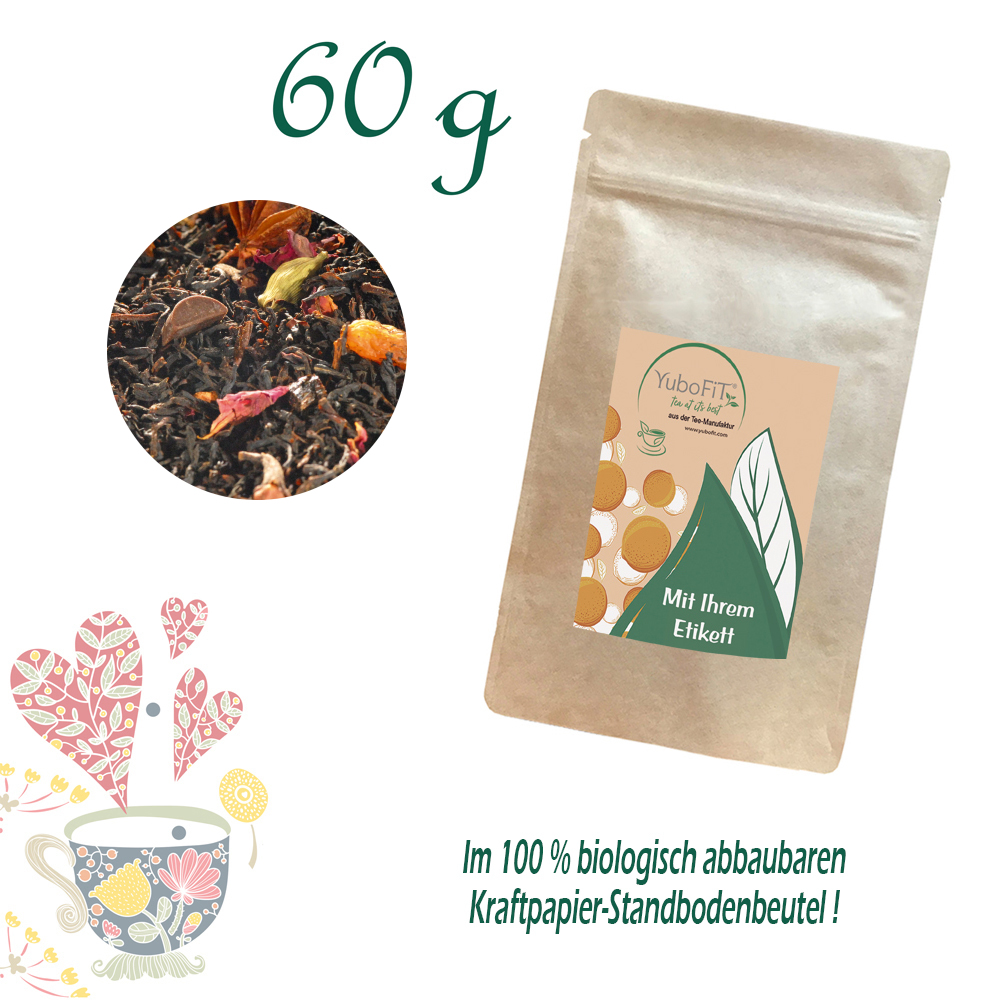 Schwarzer Tee (63%), Schokoladenstücke (6%) (Zucker, Kakaomasse, Kakaobutter, fettarmes Kakaopulver, Emulgator: SOJALECITHIN), Sultaninen, Kardamom, Sternanis, Aroma, Orangenschalen, Gewürznelken, Zimtstücke, Rosenblütenblätter, Vanille.