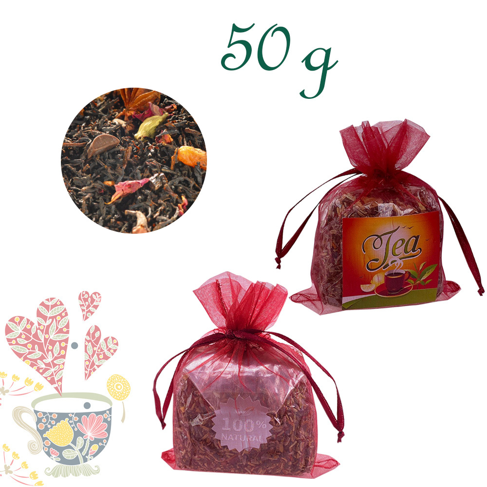 Schwarzer Tee (63%), Schokoladenstücke (6%) (Zucker, Kakaomasse, Kakaobutter, fettarmes Kakaopulver, Emulgator: SOJALECITHIN), Sultaninen, Kardamom, Sternanis, Aroma, Orangenschalen, Gewürznelken, Zimtstücke, Rosenblütenblätter, Vanille.