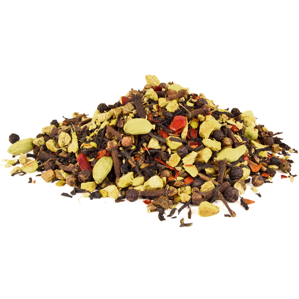 Schwarzer Tee (26%), Ingwer, Gewürznelken, Kardamom, Schwarzer Pfeffer, Zimtstücke, Anis, Chiliringe, Vanille.