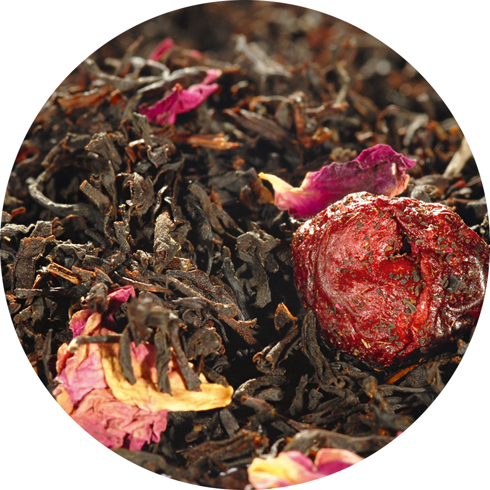 Schwarzer Tee, Aroma, Sauerkirschen (1%), Rosenblütenblätter.