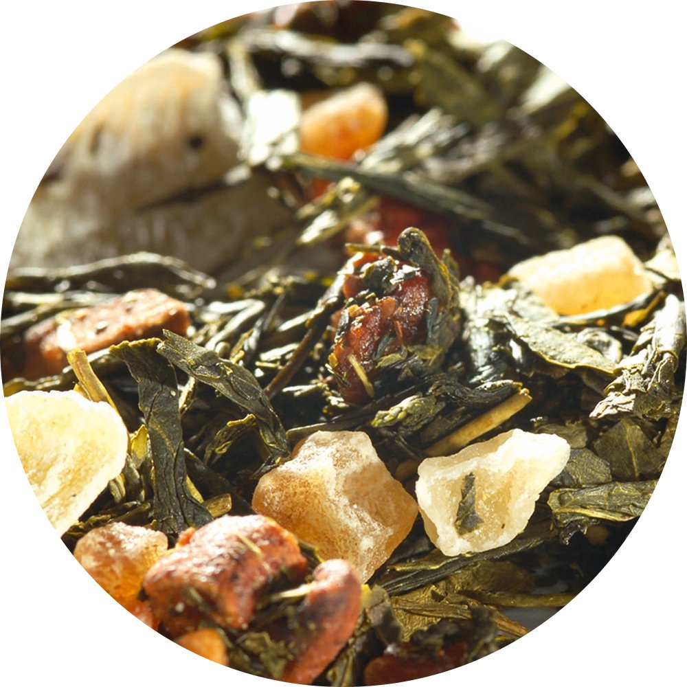 Grüner Tee (59%), Apfelstücke, Birnenstücke, Ananasstücke (Ananas, Zucker, Säuerungsmittel: Zitronensäure), Mangostücke (Mango, Zucker, Säuerungsmittel: Zitronensäure), Papayastücke (Papaya, Zucker), Aroma, Kiwistücke (2%), Säuerungsmittel: Weinsäure.