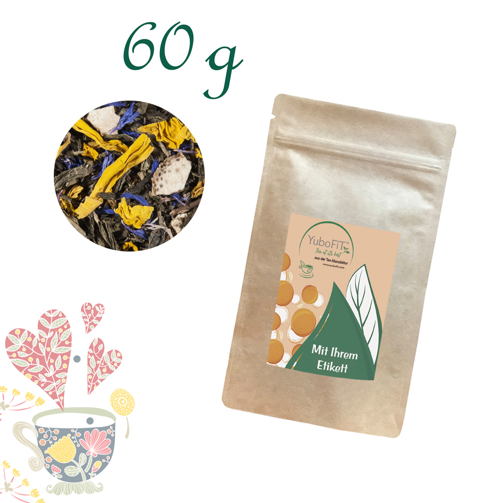 Entkoffeinierter Grüner Tee China Sencha (90 %), Zitronenschalen, Sonnenblumenblüten, Aroma, Kornblumenblüten