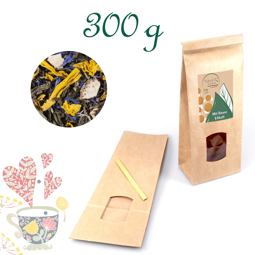 Entkoffeinierter Grüner Tee China Sencha (90 %), Zitronenschalen, Sonnenblumenblüten, Aroma, Kornblumenblüten