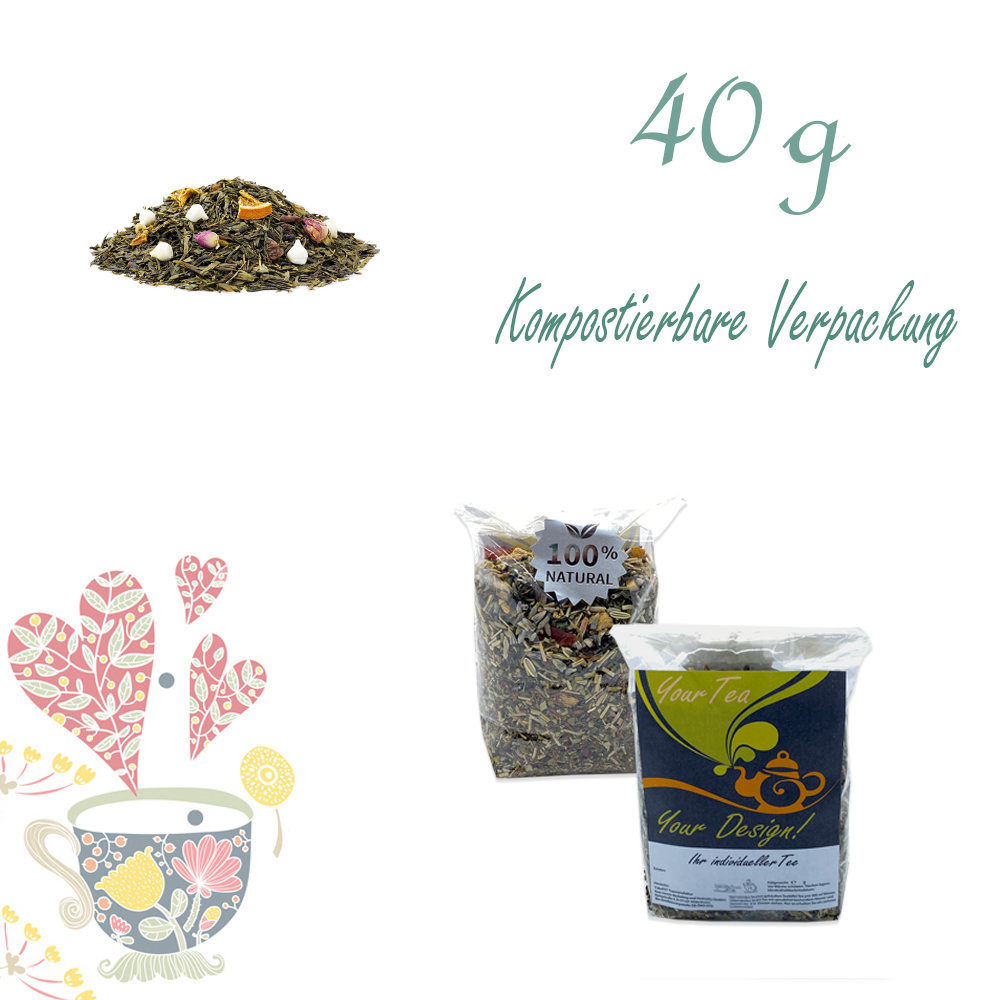 Grüner Tee (61%), Baiserhütchen (10%) (Zucker, HÜHNEREIWEISSPULVER), Sultaninen, Rosenknospen, Orangenecken (6%), Kardamom, Gewürznelken, Aroma, natürliches Orangen-Aroma.